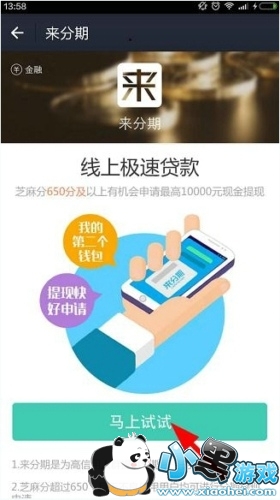 第一步:打开支付宝,点击“芝麻信用”---“信用生活”---“来分期”,进入来分期页面之后,点击“马上试试”;