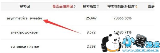 第八步:大家可以看到,我选定以后进行降序排列以后,显示第一个的单词为“asymmetrical sweater”,不规则毛衣,因为现在很多欧美国家的季节和我们的季节性是一样的,所以冬天到了,很多人会关注毛衣类的产品,那我们根据这个关键词去找产品,爆款的几率会高很多。