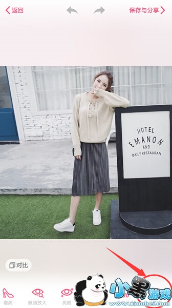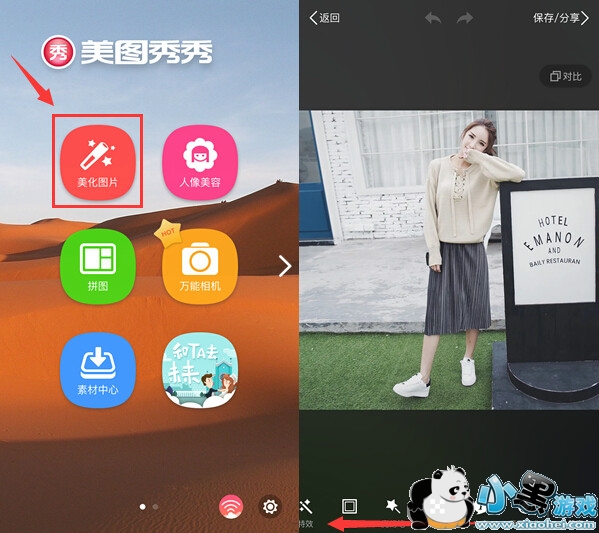 1)首先,打开美图秀秀,然后点击【美化图片】,选择自己需要P的图片,接着把下面的工具栏往左拨动。(如下图所示)