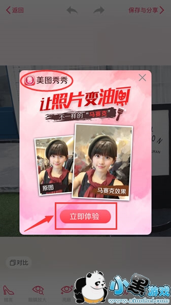 不过需要注意的是,美颜相机里的马赛克是直接跳到美图秀秀中的马赛克功能,也就是说美图秀秀才有马赛克功能,点立即体验即可。如果手机上已安装美图秀秀的朋友可以直接用美图秀秀打马赛克。