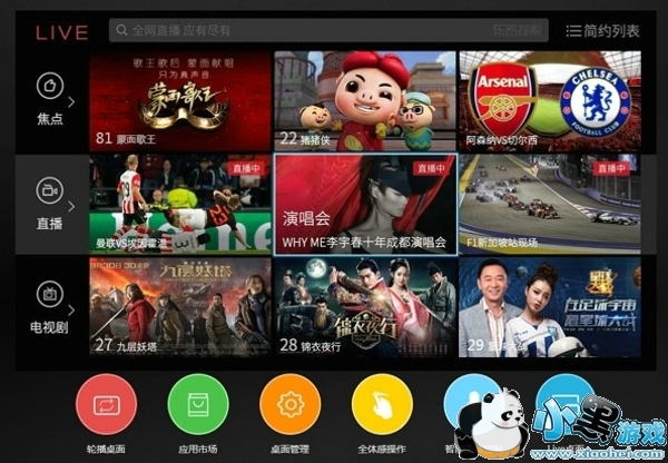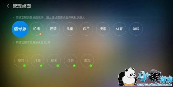 乐视分体超4 Max70在主页设置了“信 号 源”、“轮 播”、“视 频”、“儿 童”、“应 用”、“搜 索”、“体育”、“游戏”等八大主菜 单,可以非常方便的通过遥控器进行切换。但这些频道并不是一成不变的,您可以通过“桌 面管 理”来选择需要显示或关闭的主菜单,并且可以调整显示的顺序。