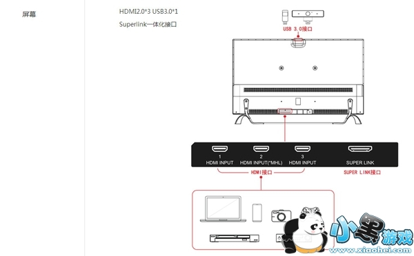 乐视分体超4 Max70的扩展接口非常丰富,在电视的背部有3个H DMI接口,其中一个H DMI接 口支持M HL连 接。此外,还有一个SuperLink接 口,可通过SuperLink定制线(可支持H DMI输出)连接分体式主机。