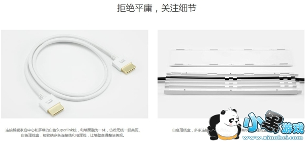 为了让你使用更方便,分体设计的超级电视接口分布也颇为用心。不常插拔的视频类HDMI接口设在屏幕端,数据、音频相关的USB和光纤音频输入/输出则在智能家庭中心端。两者通过与白墙一样颜色的Superlink定制线来连接,传递控制命令信号。贴心的是各种延长线,和白色集线盒,让你壁挂时使用方便又美观大方。