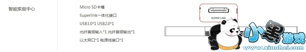 在分体式智能家庭主机上还配备了一个U 3 .0接 口,一个U 2.0接 口, 一个MI CRO S D 卡 槽,一个网 线接 口,连接电视的S uperLink接 口等,扩 展功能十分强大。