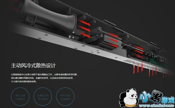 主动风冷式散热设计让智能家庭中心在狭小体积下能长期稳定工作,主要考虑热量的传导问题,我们通过喇叭风管的对流、金属件的传导、以及纳米涂层材料的应用,大大提升其内部的散热效果。
