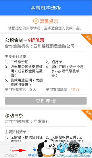 4.点击申请贷款查看符合自己贷款需求的产品,点击立即申请。