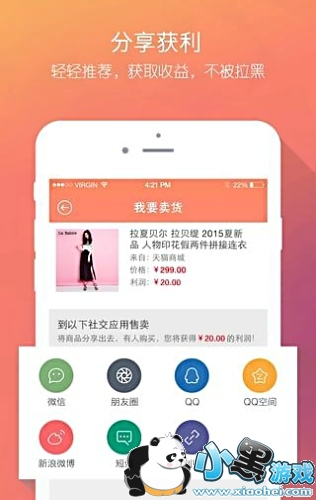 袋鼠店提供了无货开店也能赚钱的模式,简单来说,就是件将IDE店铺或是商品分享到微信、qq、等方式,朋友通过分享链接点击购买后 ,你将会获得商家的提供了佣金奖励,具体的佣金可在商品信息中查看的哦。