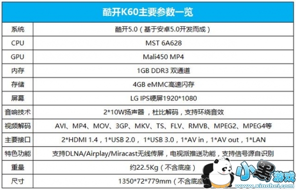 酷开K60采用强悍十核处理器,四核Cortex A7 CPU,四核Mali450 GPU,双核VPU,1GB DDR3双通道内存,4GB eMMC高速存储,原装进口60吋LG IPS硬屏,支持环绕音效和杜比解码,支持苹果、安卓手机无线传屏,配置主流,性能出色。下面,从外观、屏幕、系统、资源等方面,逐一体验酷开K60的魅力。