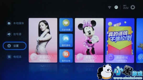 酷开5.0系统,UI呈现扁平化,横屏滚动显示,界面主要分为影视中心、游戏中心、应用圈、教育中心、酷开商城等板块。左侧常用功能采用隐藏式设计,既保持了界面的美观,也能方便用户最便捷地调出功能设置模块。