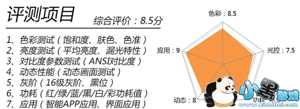 我们将电视调节至标准图像模式,背光调整至最亮其他默认,而产品的全部测试项目及评分结果做成五维性能图。
