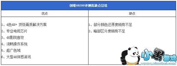 从以上画质部分的评测我们可以看到,色域值方面,创维G8200用很少国产电视能达到的水平证明了RGBW面板同样可以拥有好画质,在光控方面的能够很好的控制暗部与亮部表现,亮部能亮得上去,暗部能沉得下去,暗部细节刻画得到很好的保留,但是黑色区分度稍有不足,全黑漏光情况比较轻微;色彩方面,色彩还原度和饱和度都处于优秀水平;动态画面处理由于有4K MEMC+的解决方案,动态画面表现力还是十分不错的。