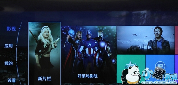 菜单方面各个分区比较简洁,分为“影视”、“应用”、“我的”、“设置”等几项,右侧则为默认的推荐内容与应用的快捷方式,首先看到“影视”,采用win8磁贴式设计,每块此贴为一个版块,“新片栏”提供各大院线的新片资源,用户可以做到足不出户便可尽心各种大片;“好莱坞影院”资源以好莱坞影片为主,专属喜欢看美国大片的用户;除此之外,酷开系统还设置了热播榜,用户可以根据热度选择影视资源享受。出于政策问题,诸如“电视节目”等有关电视直播的磁贴是无法使用的。