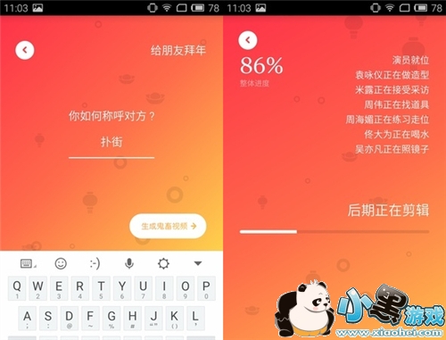 二、开启App后,不用输入台词,直接点击右下角的“鬼畜拜年”按钮就可以了。接着,输入拜年对象的身份,输入拜年对象的名字或者昵称,就可以生成鬼畜拜年视频了!在生成的过程中,鬼畜输入法App会列出鬼畜视频的素材来源,很有参与感!