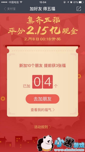 这五张福分别是“富强福”、“和谐福”、“友善福”、“爱国福”和“敬业福”。而这五福获得方法也很简单:你只需在支付宝“朋友”里新添加10个支付宝好友,就能获得3张福卡,这三张福卡是随机的,有可能是三种不同的福,也有可能是重复的福,但是只有集齐五张,才有机会平分春晚2亿大红包。所有另外得福的办法就是找好友讨福,你可以将多余的福送给好友,也可以向好友讨要你缺的福。