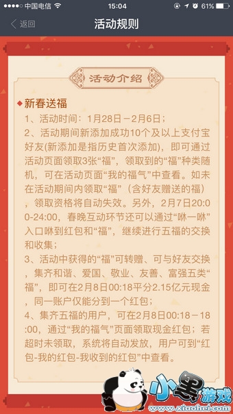 支付宝在对抗2016微信红包大战中,推出了五福袋来试图充实自己存支付的方式,整理用户的支付好友列表。新春集五福可以获得马云爸爸2016年猴年2亿元的红包!活动方式就是在支付宝最新版的首页“新春送福”一栏中就可以参加集五福的活动了。
