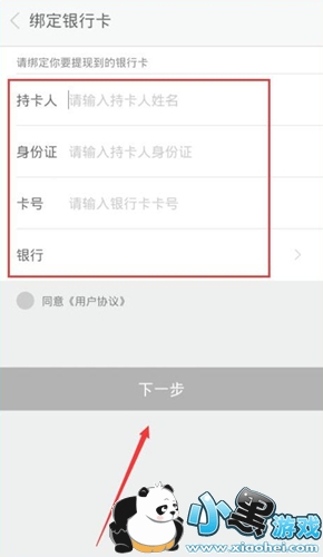 4、然后进行绑定银行卡,输入持卡人、身份证、卡号及银行,点击下一步;