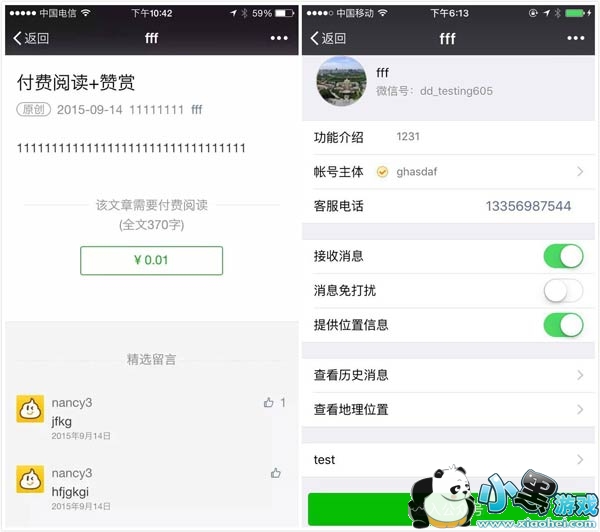 截图来自于一个名叫“fff”的测试账号,根据这个账号历史消息内容,以及信息乱填能够获得认证等证据来看,此账号应该是属于微信官方。基于此可判定,不论是否上线,“付费阅读”功能进入测试阶段已是无疑。