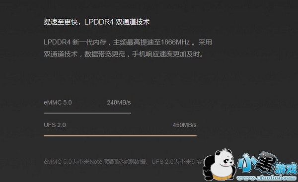 闪存:新一代UFS闪存技术。它革新存储方式,速度大幅提升,比这一代 eMMC 5.0 技术提速 87%。使用了配备 UFS 存储的小米5,你会有直观的感受,游戏加载、打开应用、浏览照片,都比现在快很多。