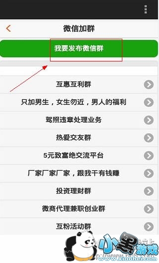 2、在首页我们看到许多内容,例如“微信加粉丝”、“微信互粉”、“微信加群”等内容,接下来就先看一看“微信加群”这个版块吧,点击进入“微信加群”里将看到以下内容,可以点击“我要发布微信群”试试