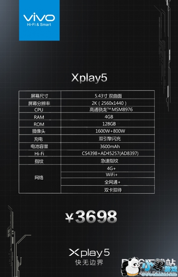 vivo xplay5多少钱?vivo正式公布了Xplay5两个版本的售价信息,Xplay5配备高通骁龙MSM8976、4GB运存,售价3698元;而Xplay5旗舰版配备高通骁龙820、6GB超大运存、Hi-Fi 3.0,售价4288元,将于3月16日开卖。