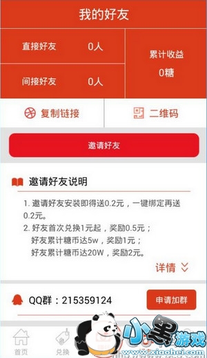 3、邀请好友:在这里你邀请好友安装即可得0.2元,一键绑定再送0.2元,同时好友还可以得到额外收入,并且好友在赚钱的同时你还可以从中获得提成收益哟。