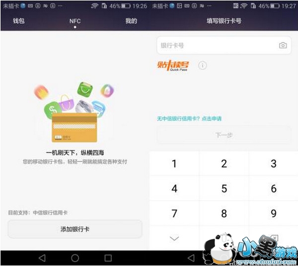 2.然后找到华为钱包,打开选择NFC,添加银行卡,注意现在只能使用中信银行的信用卡。把卡贴在上面就可以了,都不用手动输入卡号。绑好了就可以。