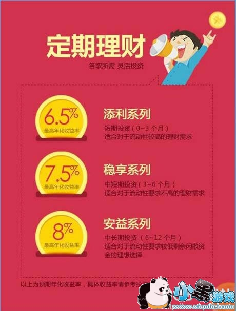 2、稳享系列:最高年化收益率为7.5%,中短期投资(3~6个月),适合对于流动性要求不高的理财投资。