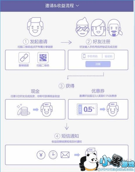 1、邀请奖励:邀请好友3人及以上,即可获得0.5%加息券1张。被邀请人在活动时间内成功投资理财项目(除新手专享),邀请人均可获得现金返利(邀请好友人数未达3人同样适用),返利计算公式如下: