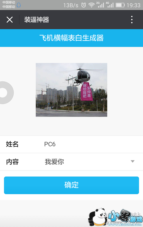 直升飞机表白示爱横幅图片软件怎么玩?PC6小编刚又收到朋友圈最新版装X神器,第一时间来给大家分享,飞机横幅表白图片生成器是一款超炫酷的示爱图片生成软件,要给男神女神们表白的话,必须这么高逼格,不对,是高规格。下面就由小编来给大家介绍飞机横幅表白图生成器的玩法吧。
