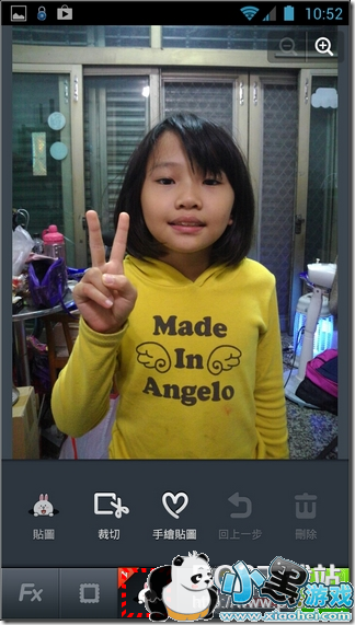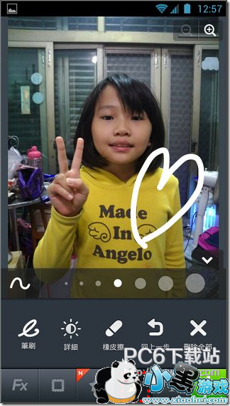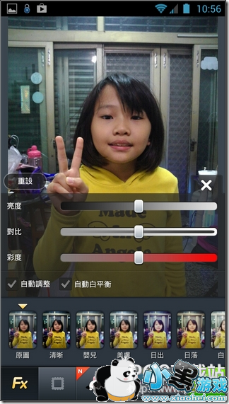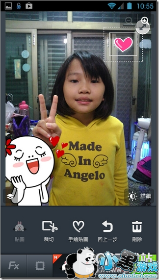 拍照后可以执行「详细」来调整亮度与对比,画面下方可以选择滤镜、相框、贴图、涂鸦、文字等美工效果