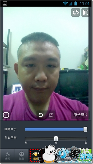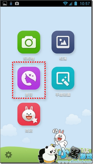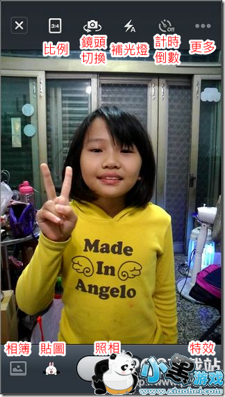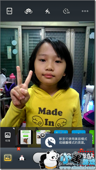 有些人刚开始使用会找不到「美容模式」界面怎么切换,只要执行右下角的切换键即可(我个人觉得这个模式比较直觉好用),虽然可能很多人都比我会用「LINE camera」,但在此还是简单的由基本功能开始介绍,执行「照相机」开始拍照(「相簿」则是由现成的照片挑选进行加工):