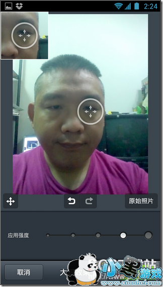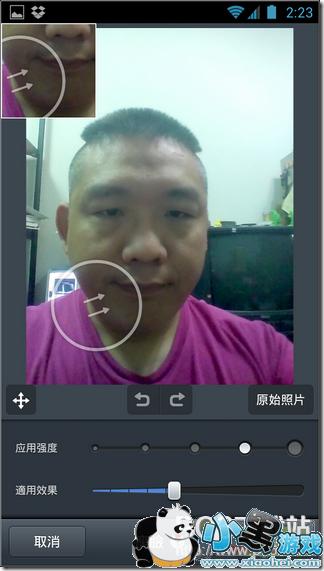 在这边的「瘦脸」功能就是由使用者自己决定要瘦哪个角落与方向性,甚至可以往外推,灵活度更大: