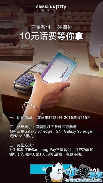 为了加大推广力度,对抗苹果Apple Pay,三星官方宣布推出绑卡送话费活动。即日起至4月15日,只要成功注册三星智付并添加银行卡就可以轻松拿到10元话费,名额不限。(详情可见Samsung Pay APP内活动通知)