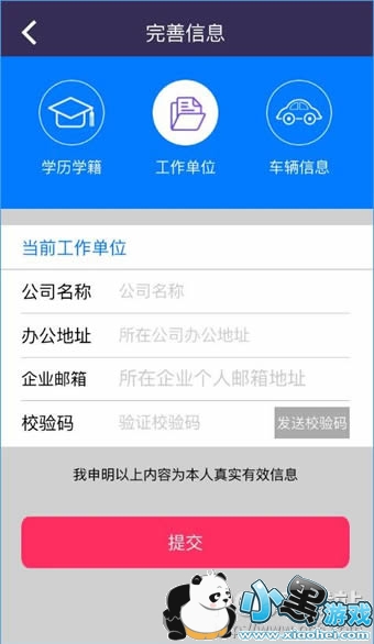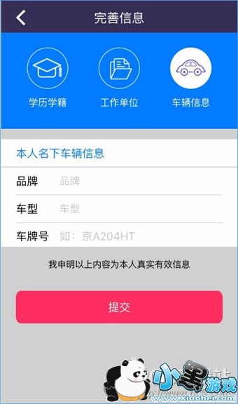 2、在完善信息页面,用户输入学历学籍、工作单位及车辆信息即可快速增加你的流量信用额。
