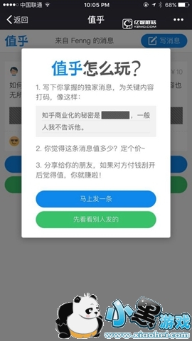 而如果你点击进“值乎”的消息,会出现一条勾起你好奇心的“打码”信息——到了这一步,几乎无法压抑自己的好奇心,“到底这条价值 x 元的消息是什么?”