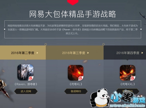 据悉,网易将推出多款大包体精品手游,除了目前较为火爆的《RAVEN:掠夺者》之外,还将分别在第三和第四季度推出两款手游,《代号XL》和《代号XXL》。