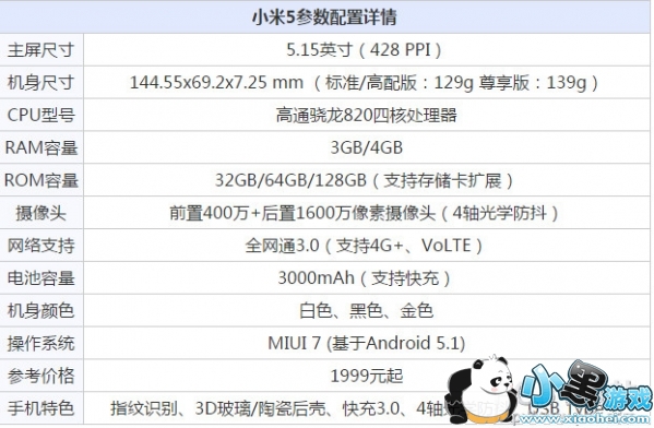 小米5有三个版本搭载1.8GHz骁龙820的小米5标准版售价1999元,具体规格为3GB RAM+32GB ROM,采用3D玻璃设计。搭载2.15GHz骁龙820的小米5高配版售价2299元,同样是采用3D玻璃机身设计,内存组合为3GB RAM+64GB ROM。搭载2.15GHz骁龙820的小米5尊享版售价为2699元,采用的则是3D陶瓷机身设计,内存组合为4GB+128GB。此外,该机采用5.15英寸1080P显示屏,采用极窄边框设计,整个机身重量为129g。搭载高通骁龙820处理器,配备3G/4G LPDDR4双通道内存,采用32GB/64GB/128GB UFS2.0高速闪存,同时支持4G+网络,最高下载速率600Mbps,支持VoLTE语音技术,采用USB-Type-C接口,支持全功能NFC。小米5后置摄像头采用了索尼1600万4轴防抖相机,支持相位对焦,前置相机则是2微米400万像素摄像头,电池容量为3000mAh,支持快充3.0,一个小时可充满80%~90%。支持双卡双待,全网通,支持红外遥控。