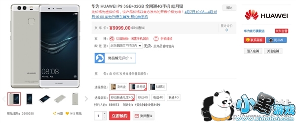 京东华为官方旗舰店已经上架了P9(接受预约),可以看到它共有四个版本,分别是全网通版本、电信、联通、移动4G版,后三者配色上只有银色和灰色可选,而前者还多了一个金色版,其都支持双卡双待功能。