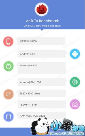 据安兔兔放出的配置信息显示,一加手机3采用1080P分辨率屏幕,搭载高通骁龙820处理器,4GB RAM+32GB ROM存储组合,支持扩展,800万+1600万像素组合摄像头,运行基于Android 6.0.1的氢OS正式版操作系统。