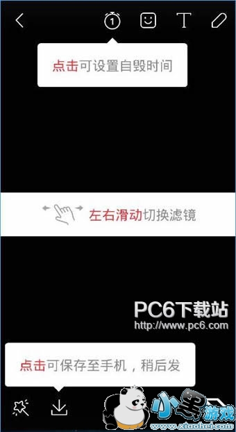 3、然后点击上方的闹钟还可以设置自毁时间,左右滑动可以切换滤镱,同时点最下方的保存即可快速保存你录制的视频。