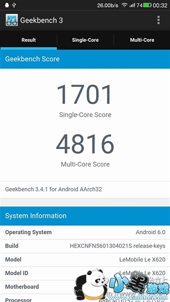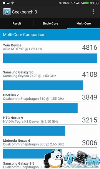 GeekBench 3是我们考察CPU单核心、多核心性能的最常用、最权威工具,Helio X20得到了单核心1701、多核心4816,查询GeekBench测试数据库可知这个成绩十分正常。相比之下,Helio X25单核心一般在1800分左右,多线程则在6300分左右。也就是说,X20的单核心性能比X25低只有5%,多核心性能则低了超过20%。