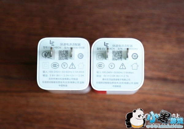 具体型号为EQ-24BCN,深圳市坤兴科技有限公司制造,全球通用电压100V-240V、50/60Hz,输出支持3.6V/3A、8V/3A、12V/2A,最大功率达24W。此前的EV-24ACN输出支持5V/3A、9V/2.7A,最大功率也是24W,但是现在快充规格从QC2.0提高到了QC3.0,并加入了乐视的智能保护功能,被称为乐闪充技术。