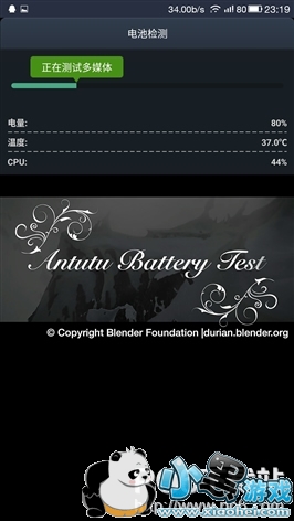 续航考察主要使用安兔兔硬件检测中的电池测试部分。它会循环进行游戏测试、GPU满负载测试、网页测试、多媒体测试,并实时显示剩余电量、温度和CPU占用率(大多都在40-70%),直到达到预设的电量值,或者手动暂停。测试过程中,亮度为自动设为100%。