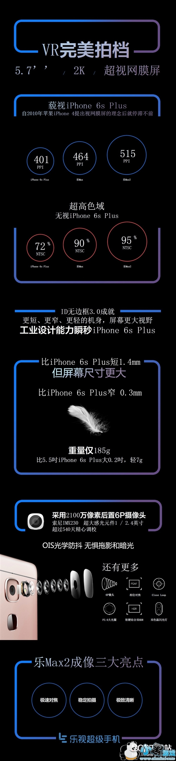乐Max 2不但有一体化金属机身,还首次采用了三次阳极氧化技术,ID无边框3.0,整机重量185克,号称工业设计秒杀iPhone 6S Plus。