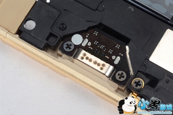 将魅族PRO 6的外放音腔移除后可以看到USB Type-C接口的完整电路,可以看到USB接口后方还有一颗控制芯片。