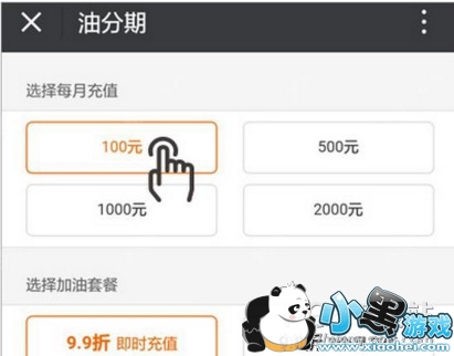 1、首先下载最新版本的油分期。进入首页点击“选择每月充值”和“选择加油套餐”: