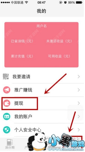 首先下载最新版本的油分期,在“我的”页面中点击“提现”: