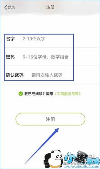 2、在注册页面,输入名字、密码,然后点击注册即可快速注册成功。