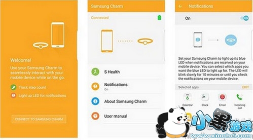 功能上,Charm可以追踪步数、旅行距离、卡路里(热量单位),它还可以为用户提供呼叫、短信、社交媒体信息,借助彩色LED通知用户。Charm可以和三星S Health(4.6或者更高版本)应用程序搭配使用,也就是通过蓝牙与Android手机(ndroid 4.4及以上)同步。