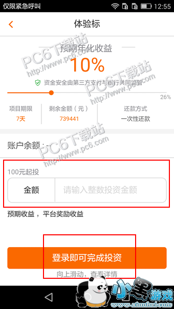 2、在体验标的界面即可看到你的账户余额,输入起投金额,然后点击立即投资即可购买体验标;